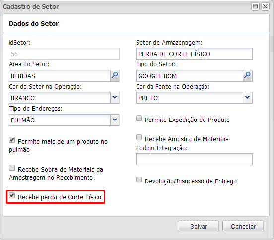 Configurar um Setor ativando o parâmetro “Recebe Perda de Corte Físico”, cujo endereço associado precisará ter cubagem suficiente para armazenar produto que foi indicado como Perda / Corte Físico.