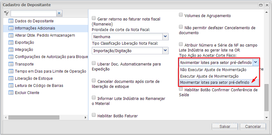 No Cadastro do Depositante / Informações Adicionais / no parâmetro “Tipo Ação ao Aceitar Corte Físico” o sistema permitirá selecionar somente a opção “Movimentar Lotes para Setor Pré-Definido”