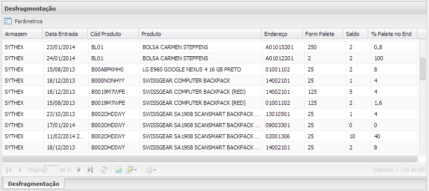 A tela de relatório de Desfragmentação exibirá diversas colunas, com a possibilidade de elaborar diversos filtros, importar arquivos para o excel, agrupar campo, habilitar ou desabilitar colunas.