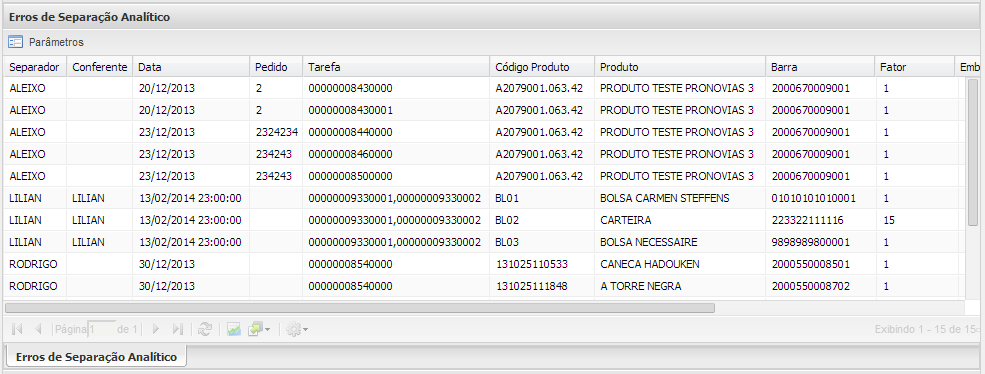 A tela de relatório de Erros de Separação Analítico exibirá diversas colunas, com a possibilidade de elaborar diversos filtros, importar arquivos para o excel, agrupar campo, habilitar ou desabilitar colunas.