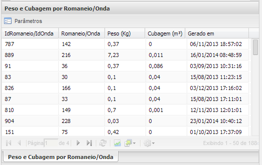 A tela de relatório de Peso e Cubagem por Romaneio / Onda exibirá diversas colunas, com a possibilidade de elaborar diversos filtros, importar arquivos para o excel, agrupar campo, habilitar ou desabilitar colunas.