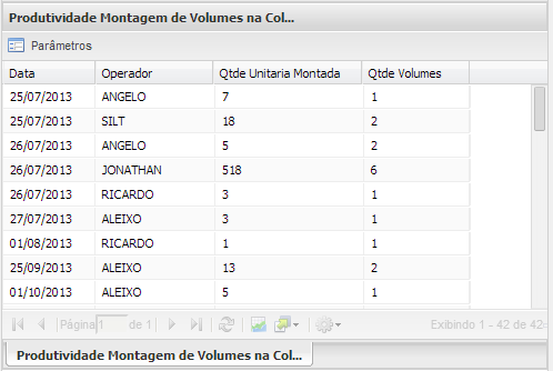 A tela de relatório de Produtividade Montagem de Volumes na Colmeia exibirá diversas colunas, com a possibilidade de elaborar diversos filtros, importar arquivos para o excel, agrupar campo, habilitar ou desabilitar colunas.