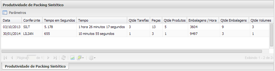 A tela de relatório de Produtividade de Packing Sintético exibirá diversas colunas, com a possibilidade de elaborar diversos filtros, importar arquivos para o excel, agrupar campo, habilitar ou desabilitar colunas.
