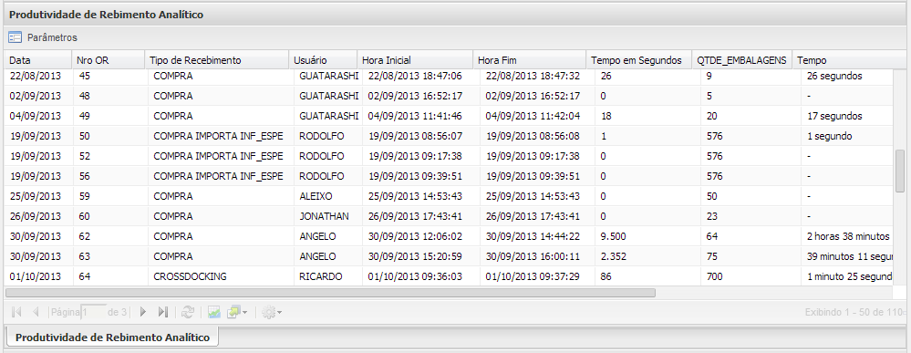 Serão exibidos no grid o intervalo de tempo de execução da Ordem de Recebimento, por um usuário numa determinada data.