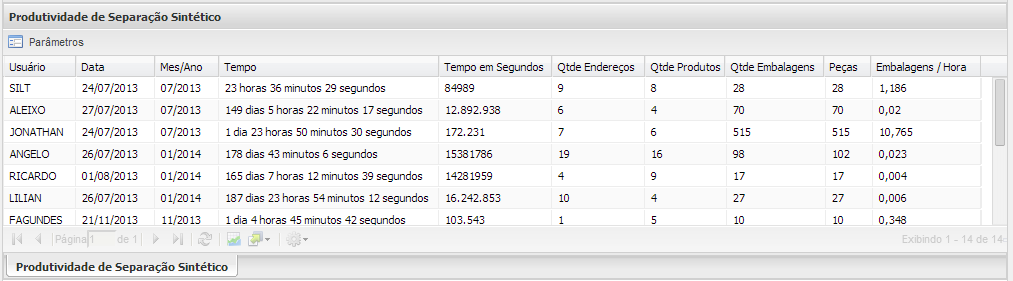 Serão exibidos no grid o intervalo de tempo de execução da Separação dos Materiais, por um usuário numa determinada data.