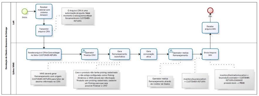 Criada integração para o Silt WMS para importar o layout no formato CRN, que será enviado quando houver Devolução de Clientes ou Insucesso de Entregas, o WMS entrará com estoque em um setor de devolução para o cliente, sem precisar realizar conferência de entrada, pois os produtos foram conferidos anteriormente, mas este setor não permitirá expedição dos produtos, sendo setor intermediário, após a entrada dos produtos no Setor de Devolução para o cliente, o operador remanejará os produtos para os Setores Definitivos. Caso seja enviado algum código de setor origem ou destino não cadastrado no Silt WMS o arquivo será recusado.