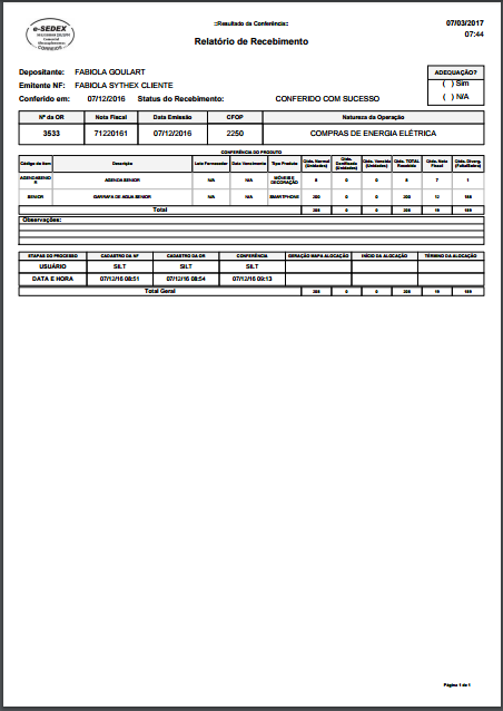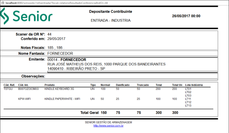 Exibirá o relatório de Resultado das Conferências Realizadas da Ordem de Recebimento, mas a partir da versão 8.8.4.0, no cadastro do Depositante da OR no sub menu: Recebimento > o parâmetro Modelo Relatório Resultado Web, estiver setado para Padrão: continuará sendo impresso o modelo de relatório abaixo: