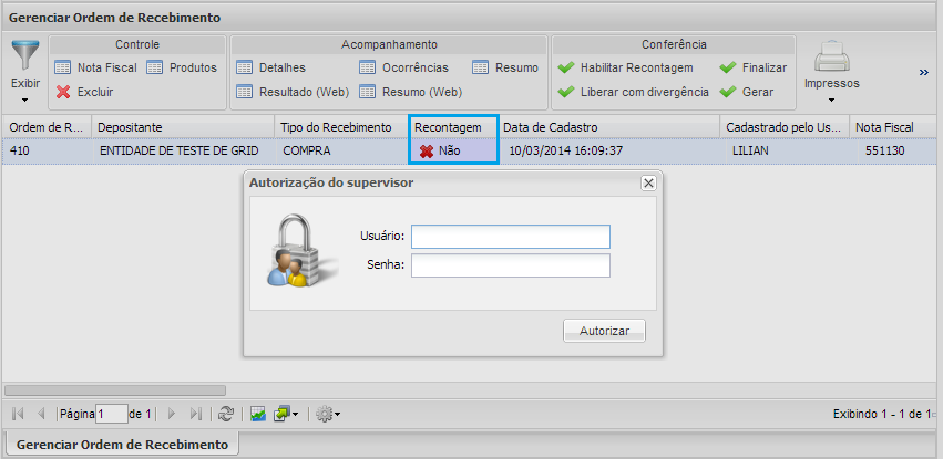 Ao clicar no botão “Habilitar Recontagem por Volume”, o sistema solicitará que seja autorizada a atividade mediante senha de supervisor.