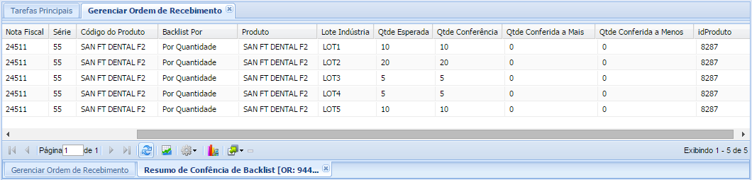 A partir da versão 7.0.0.0, apresentará um resumo comparativo entre o que foi conferido no recebimento e o que está cadastrado no Back List das Notas Fiscais presentes na OR. O botão Resumo de Back List ficará ativo se o Depositante utilizar Back List.