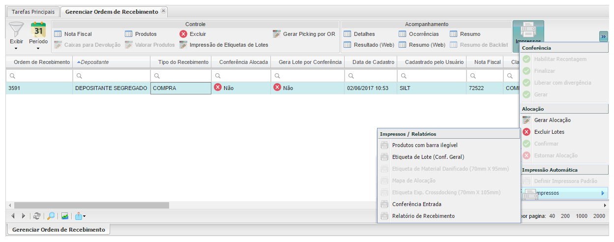 Menu: Movimentação > Entrada > Gerenciar Ordem de Recebimento