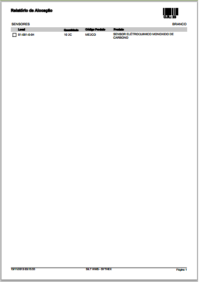 Este relatório foi criado para auxiliar na Conferência de Entrada, contém os campos código do produto, descrição do produto, código de barras escrito e em barras, descrição reduzida da embalagem e os campos para preencher: quantidade, data de vencimento, lote de indústria. Os dados apresentados no relatório de conferência de entrada serão da embalagem que estiver configurada como “Embalagem de Armazenagem” para o depositante da Ordem de Recebimento.
