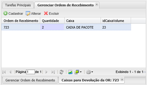A partir da versão 6.8.0.0, estará habilitado este botão, se a classificação for Devolução (Total ou Parcial), se um dos produtos conferidos no Coletor de Dados for do tipo Danificado ou Truncado e Lotes e Mapa de Alocação não gerados. Ao acionar o botão “Tipo de Caixa para Devolução” serão listados os tipos de caixas adicionados para a O.R. selecionada. Nesta tela será possível cadastrar a Quantidade e o Tipo de Caixa. Podendo cadastrar livremente uma ou mais caixas para uso na O.R., mesmo que a quantidade de caixas ultrapasse a quantidade recebida de produtos. Será possível Alterar e Excluir caixas, se a Ordem de Recebimento estiver pendente de Gerar Lote e Mapa, e o Tipo de Recebimento de Devolução possuir o parâmetro “Escolher Tipo de Caixa para Devolução de Produtos” acionado.