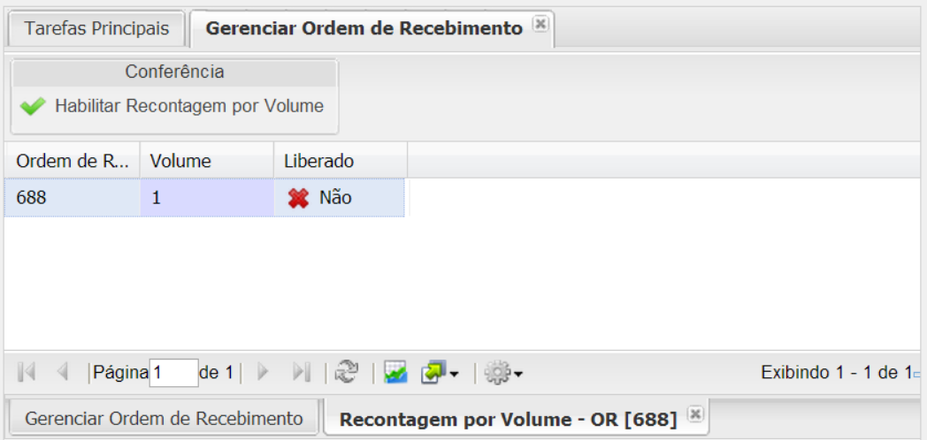 Se estiver habilitado o parâmetro “Volumes de Agrupamento”, na Configuração do Depositante / aba Informações Adicionais, abrirá nova janela, onde serão exibidas as contagens separadas por volume, e ao clicar no registro habilitará o botão “Habilitar Recontagem por Volume”