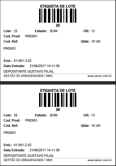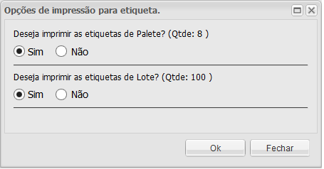 Por exemplo: foram geradas 13.437 etiquetas de lote para a Ordem de Recebimento, sendo necessário escolher pelo menos uma, ou um conjunto de opções para a impressão de etiquetas desejadas.