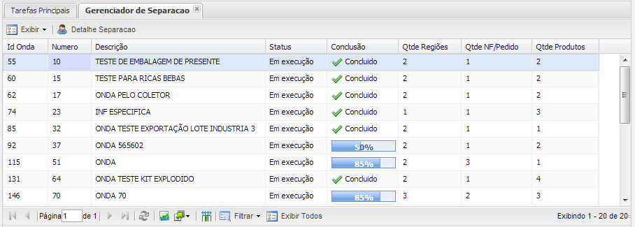 Será possível visualizar o status, porcentagem de conclusão, quantidade de regiões, pedidos e produtos por Onda.