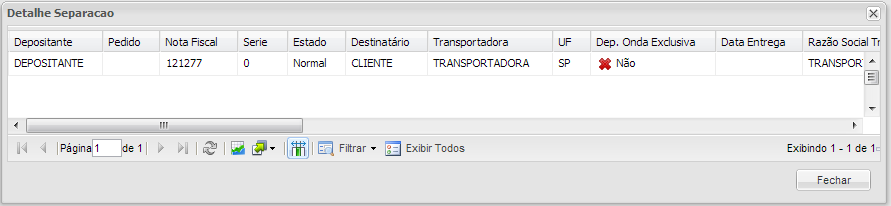 O grid da tela de Gerenciador de Separação, possui o botão Exibir que mostrará os registros: Gerados, Gerados com Corte, Liberados ou Em Execução, e com o botão Detalhe Separação.