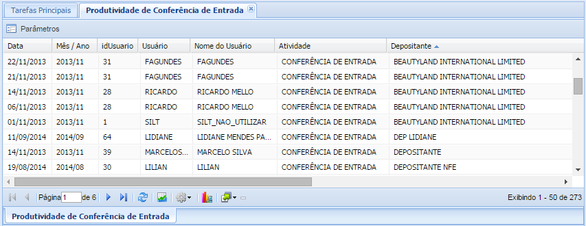 Serão exibidos os produtos, suas quantidades produtos, de itens conferidos, referente as atividades de Conferência de Entrada executadas por usuário. Os dados serão exibidos após selecionar uma determinada data e/ou digitar a Razão Social de um depositante.