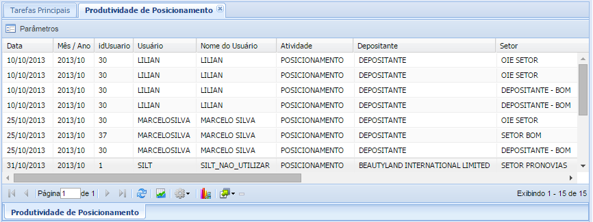 Serão exibidos os setores e regiões visitados, quantidade produtos, referente as atividades de Posicionamento executadas por usuário. Os dados serão exibidos após selecionar uma determinada data e/ou digitar a Razão Social de um depositante.