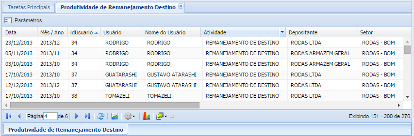 Serão exibidos os setores e regiões visitados, quantidade produtos, de itens conferidos, referente as atividades de Remanejamento Destino executadas por usuário, após selecionar uma determinada data e/ou digitar a Razão Social de um depositante.
