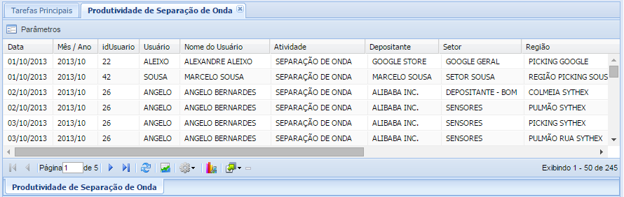 Serão exibidos os setores e regiões visitados, quantidade produtos, de itens conferidos, referente as atividades de Separação de Onda executadas por usuário, após selecionar uma determinada data e/ou digitar a Razão Social de um depositante.