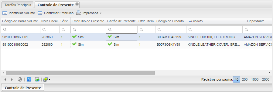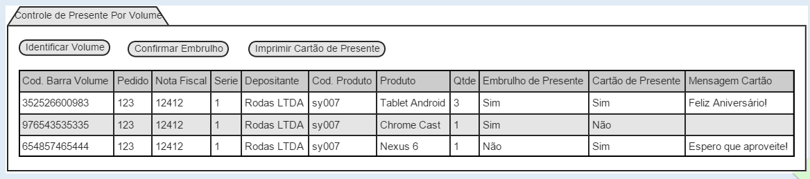 O grid possui os botões Identificar Volume, Confirmar Embrulho e Impressos.
