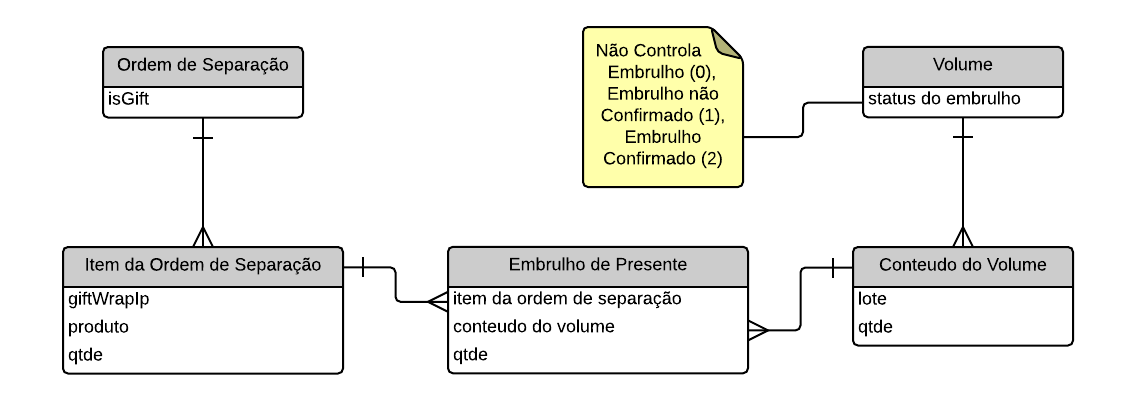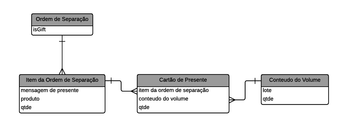 Ao identificar o Conteúdo do Volume, o sistema localizará o produto correspondente nos Itens da Ordem de Separação. O item será marcado para ser embrulhado como presente. Para tanto, o campo “giftWrapIp” possuirá qualquer valor diferente de vazio.