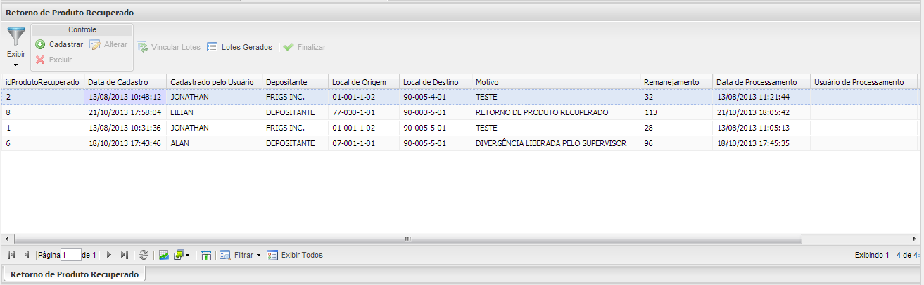 Exibirá diversas colunas, com a possibilidade de elaborar diversos filtros, importar arquivos para o excel, agrupar campo, habilitar ou desabilitar colunas.