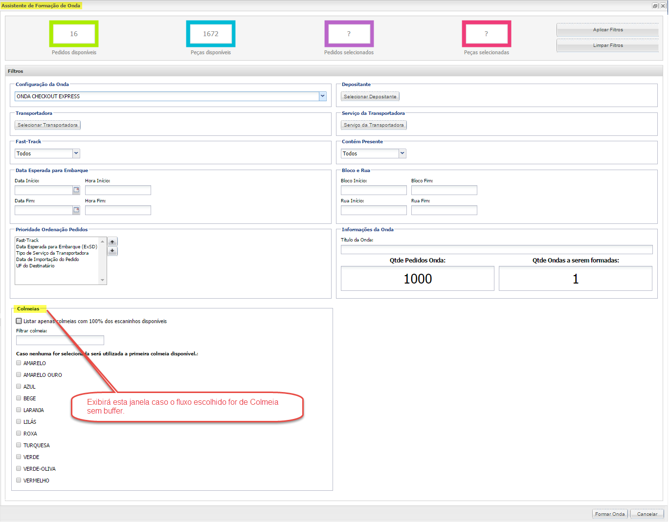 Desde a versão 7.6.1.0, somente serão selecionadas as colmeias na Formação da Onda caso o parâmetro “Ativo” do Cadastro de Colmeia esteja flegado.