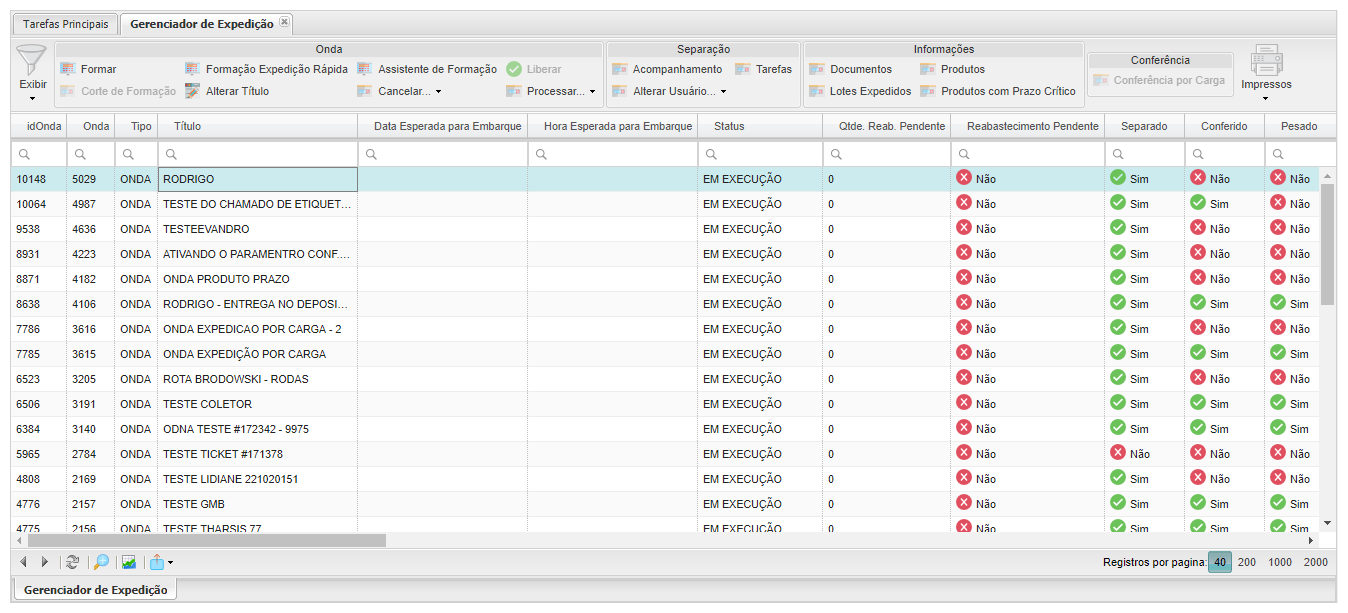 O grid da tela de Gerenciador de Expedição, possui o botão Exibir que mostrará os filtros da coluna Status que exibirá os registros: Processada, Cancelada, Gerada, Assistente de Formação, Gerada com Corte, Em Execução, Em formação e/ou Liberada.