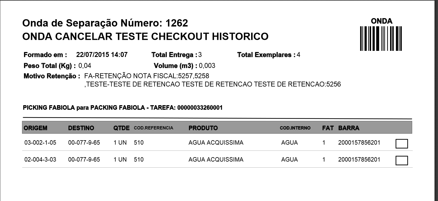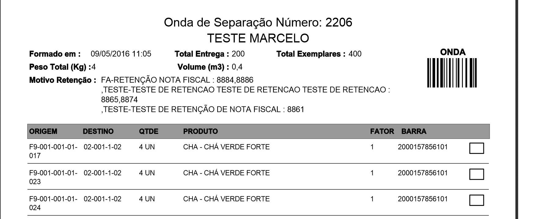 - Onda do tipo Checkout ou Fluxo de Carga ou Colmeia : exibe o motivo de retenção no relatório de mapa de separação agrupando o Motivo de Ocorrência, e lista as notas separadas por vírgula.