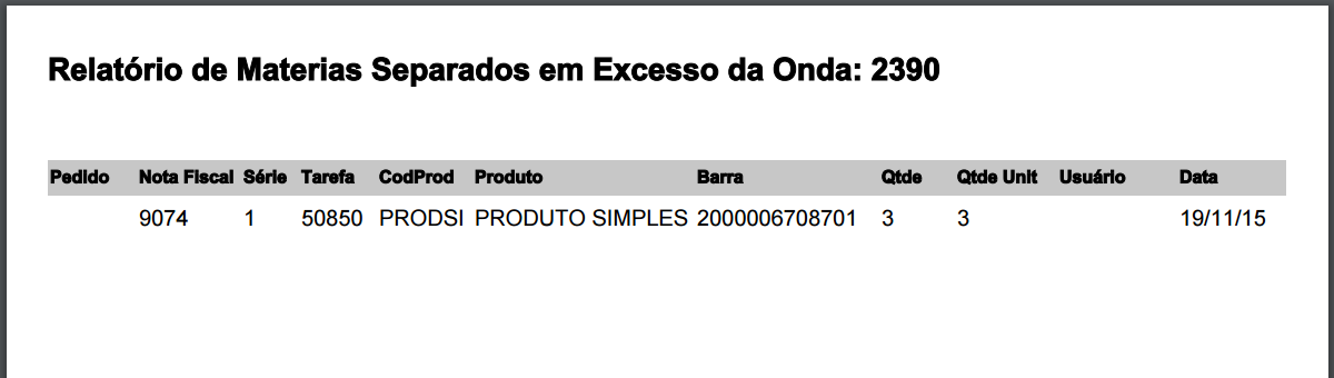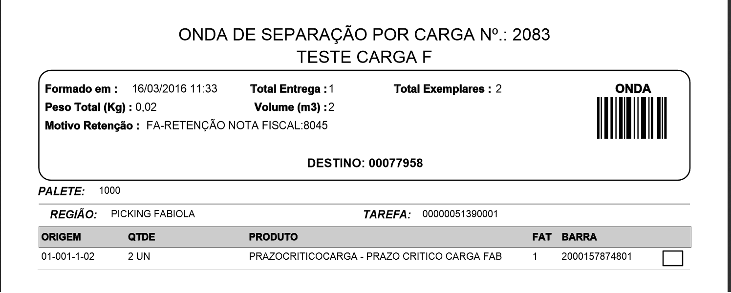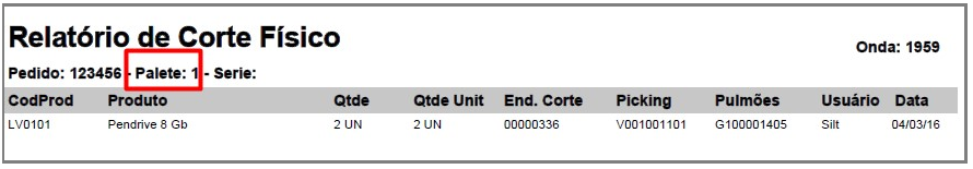 A partir da versão 8.0.1.0, quando a onda for de Expedição por Carga, o relatório exibirá o número do palete no lugar da nota fiscal.