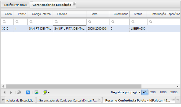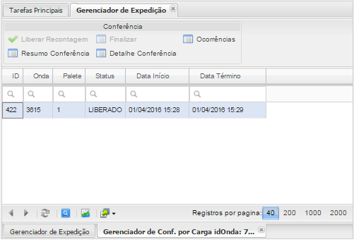 Exibirá as ocorrências das conferências realizadas, listando no grid os dados da Onda, Palete, Número da Conferência, Produto, Barra, Descrição e Status.