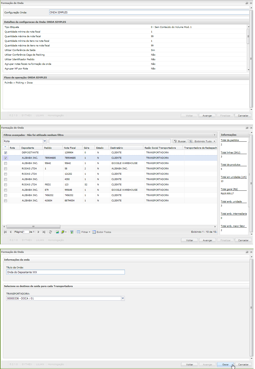 O sistema continua checando os dados para a formação da onda, como por exemplo: se a transportadora da nota tem vínculo com a doca, ou rua de expedição.