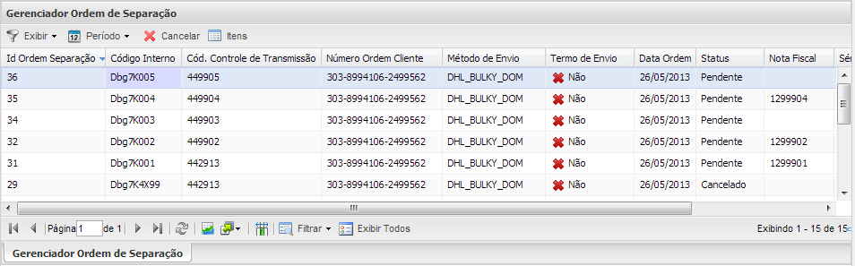 O grid da tela de Gerenciador Ordem de Separação, possui o botão Exibir que mostrará os filtros da coluna Status que exibirá os registros: Todos,Pendente, Processada ou Cancelada, com os botões: Cancelar, Itens.