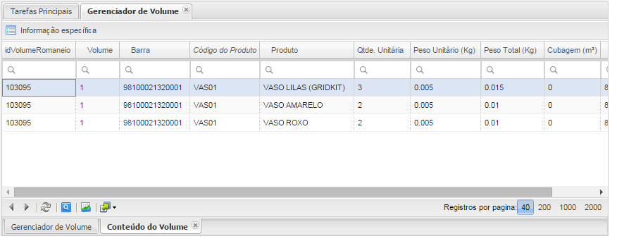 O grid da tela de Gerenciador de Volume, possui o botão Exibir que mostrará os filtros de com os registros “Pendentes”, ou “Processadas” ou “Canceladas”, o botão Período para selecionar por 1 dia, 3 dias, 7 dias, 15 dias, 30 dias ou por Período, com os botões: Conteúdo, Cancelar Volume, Desfazer Auditoria, Auditar, Alterar Tipo de Caixa e Imprimir Etiqueta.