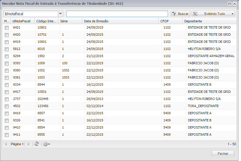 Ao clicar neste botão, serão listadas todas as notas de entrada do armazém logado. Ao selecionar uma nota, será feita a validação se os produtos e itens da nota são exatamente os mesmos da nota de saída vinculada na Transferência de Titularidade selecionada.