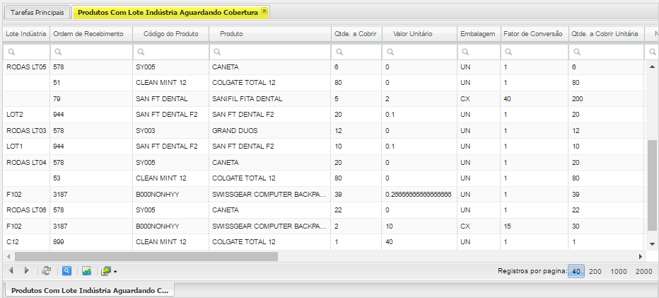 Menu: Nota Fiscal / Armazém Geral / Produtos com Lote Indústria Aguardando Cobertura.