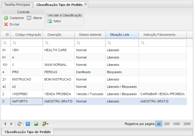 Tela criada a partir da versão 7.7.0.0, onde este cadastro será utilizado para classificar os tipos de pedidos, ou seja, definirá as características do estoque a ser utilizado para o atendimento do pedido/nota fiscal digitado, nas telas Controle Nota Fiscal, Pedido de Retorno de Armazenagem. A coluna será ainda exibida nas telas de liberação de nota fiscal para expedição e na seleção de pedidos ou notas fiscais durante a formação de onda.