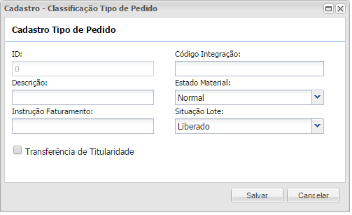 - Restrição: Este parâmetro não poderá ser alterado caso exista algum controle de transferência de titularidade em andamento usando algum pedido/nota que tenha esta classificação de tipo de pedido. Será considerado transferência em andamento tudo que não estiver “Cancelado” ou “Concluído”.