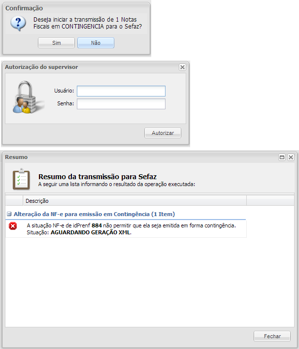 O usuário deverá informar se irá ou não realizar o Cancelamento da NF-e. Abrirá a tela de login do sistema para que o supervisor informe a senha e confirme a autorização. Caso não deseje Cancelar clique no botão “Não”. O sistema retornará para a tela de Controle de NF-e.