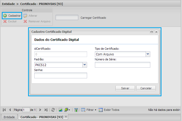 Vincule o(s) Certificado(s) Digital(is) ao cadastro da entidade. Isso serve para que seja identificado o Certificado Digital que será utilizado para envio da NF-e e geração da Assinatura Digital.