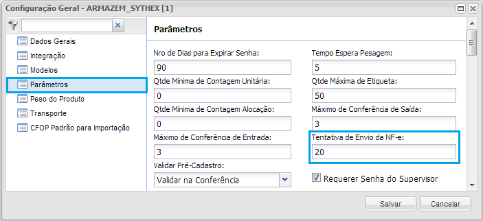 O usuário poderá configurar a quantidade de tentativas de envio de uma solicitação para a SEFAZ, ou seja, configurar quantas vezes o arquivo XML da NF-e, poderá ser enviado para confirmação de uso pela SEFAZ.