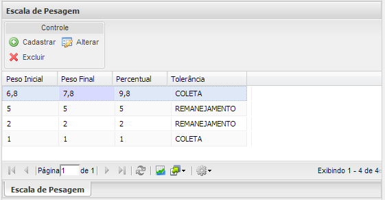 O grid da tela de Escala de Pesagem, possui o agrupamento de Controle contendo os botões: Cadastrar, Excluir e Alterar.