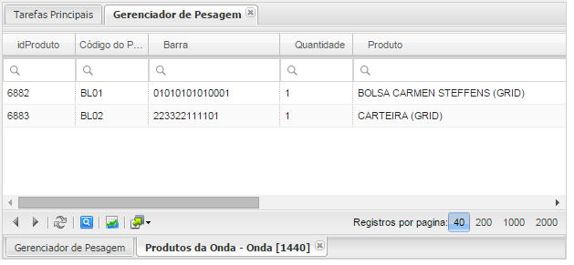 O grid da tela de Gerenciador de Pesagem, possui o botão Exibir que mostrará a coluna Status para filtrar pelos registros “Não liberado” ou “Liberado”, e os botões: Qtde Volumes, Produtos e Detalhe dos Volumes.
