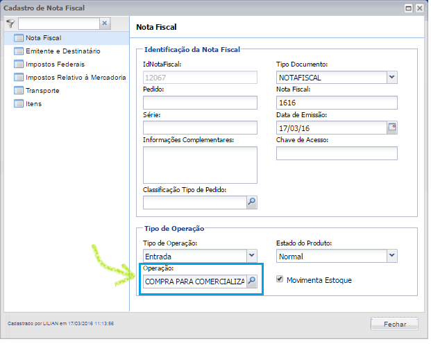 Importar ou Digitar Nota Fiscal com CFOP que foi vinculado ao Tipo de Recebimento.