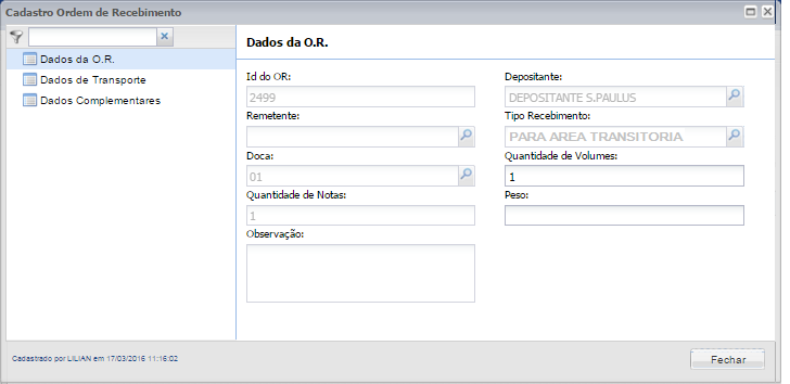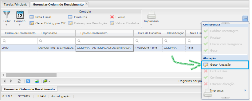 - Aplicativo SILTWMS / Movimentação / Entrada / Gerenciar de Ordem de Recebimento