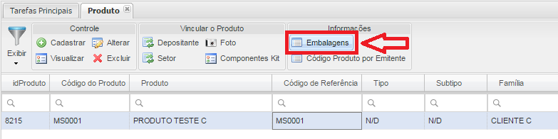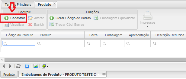 - Botão Embalagem: Vinculará as embalagens ao produto.
