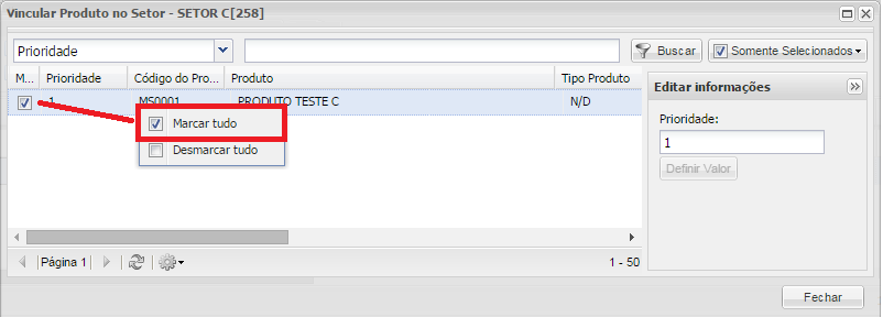 Será possível vincular um ou mais endereços ao Setor, bastando checar o primeiro campo de cada endereço, ou com o botão direito do mouse, conforme imagem abaixo, checar a opção MARCARTUDO.