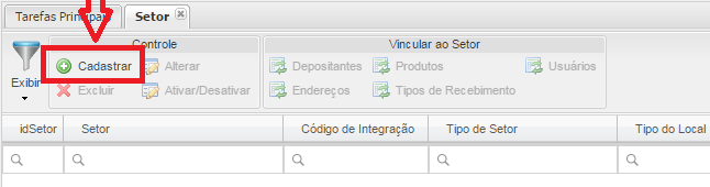 Acessar o Menu: Cadastro / Armazém / Cadastro de Setor, clicar no botão Cadastrar.