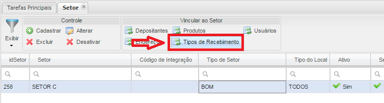 - Botão Tipos de Recebimento: Associará os Tipos de Recebimento ao Setor.